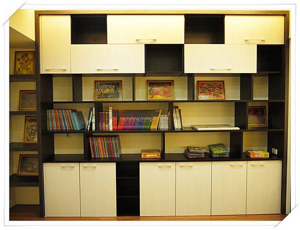 玻璃書房裡的書櫃!不規則型~一樣強調超強收納功能,左邊還不忘利用空間做一個開放展示書架!