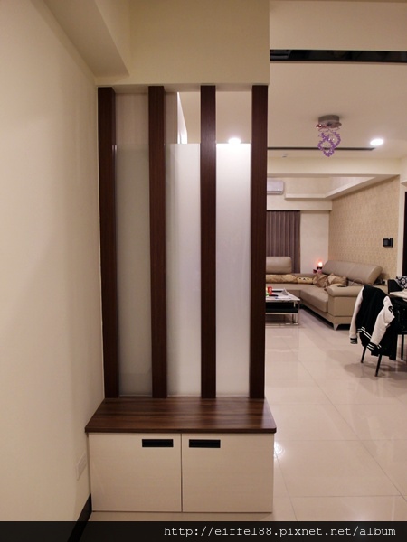 玄關處用木隔柵夾霧面玻璃來區隔空間