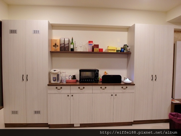 餐邊收納櫃及旁邊的收納高櫃為家裡增加更多收納空間