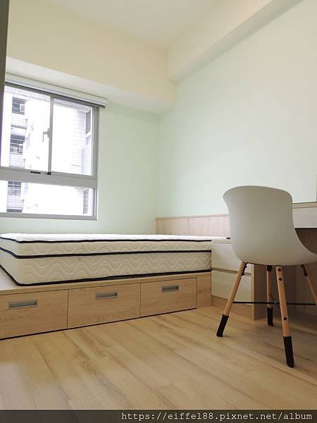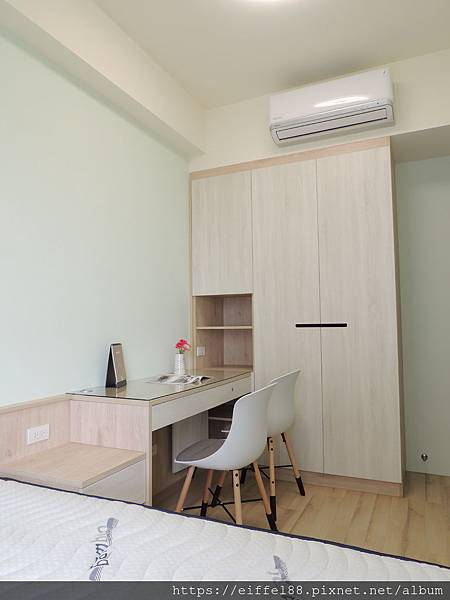 臥室規劃相同色系的衣櫃連接書桌、多功能床組